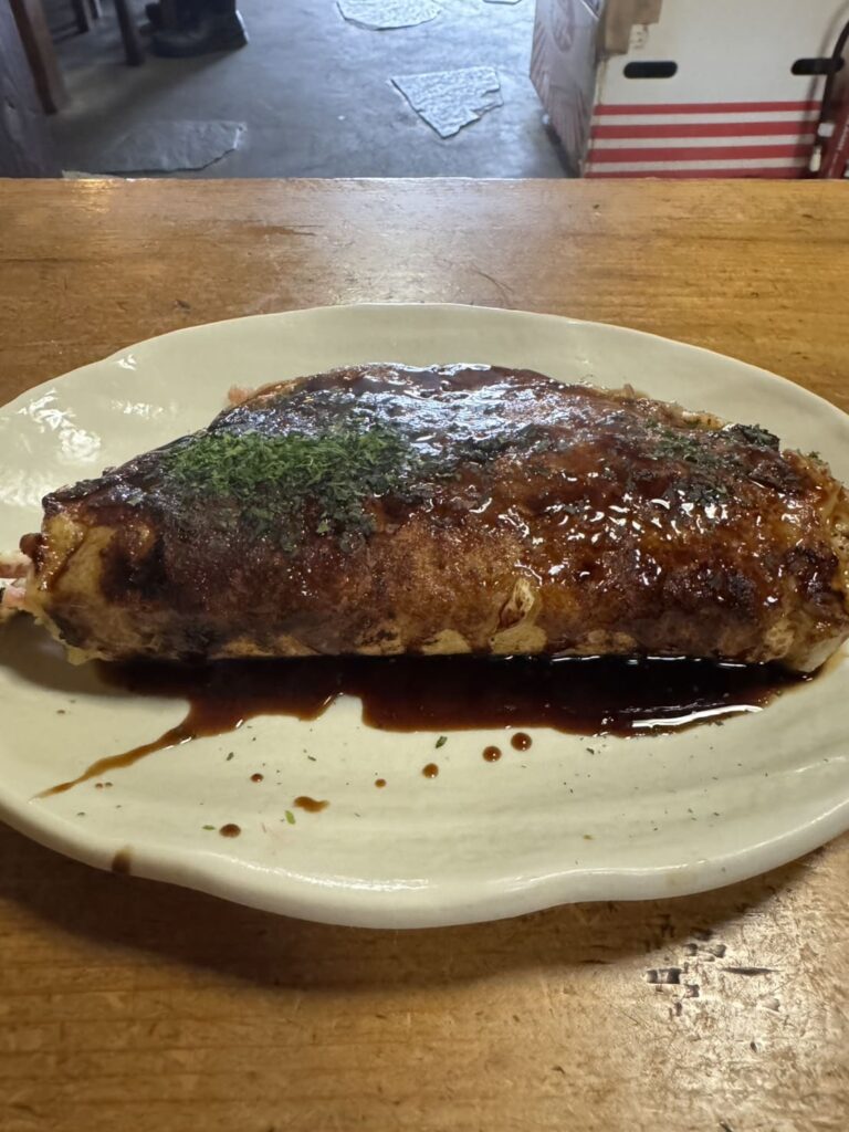 お昼ご飯は駅前の鉄板焼屋でお好み焼きを頂きました!